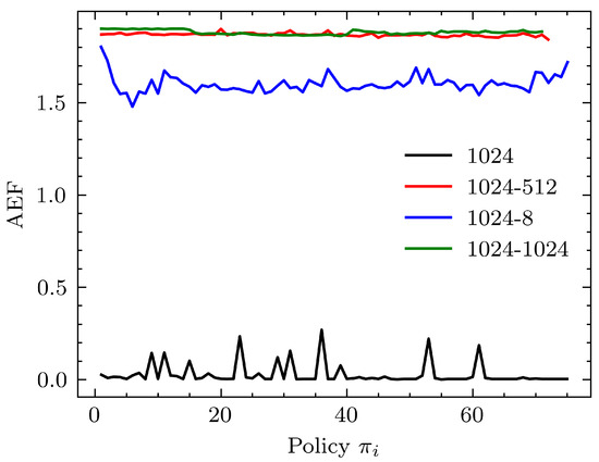 For the learning module, several dense layer architectures were tested and compared. As seen in Figure 7, we tested 1024, 1024-8, 1024–512 and 1024–1024 dense layer configurations. The configuration is in the form (1st layer parameters)–(2nd layer parameters (if present)), omitting the bias parameter. Testing was limited to 2 dense layers since the emphasis was on lightweight models. We used 1024 parameters in the 1st layer in all test cases, as the perception module output was 1024 features with MobileNet. The experiments demonstrate that the performance of the learning system with regard to AEF is better for the single-layer 1024 configuration. A slower rate of responsibility shift may be needed for larger networks for better policy evolution, as the data needed for training may be high for larger networks.