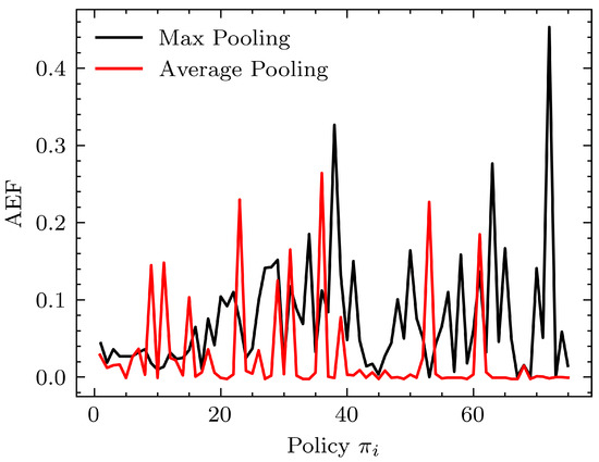 The results suggest that the performance of the average pooling layer is slightly better than that of the max pooling layer with respect to the AEF. When using average pooling, the results were stable in terms of performance compared to the varied noisy performance when using max pooling. This may suggest that when extracting features from the filters of the CNN, focusing on overall average features rather than sharp prominent features is desirable in the context of predicting the steering direction for a given image frame using a single dense layer network.