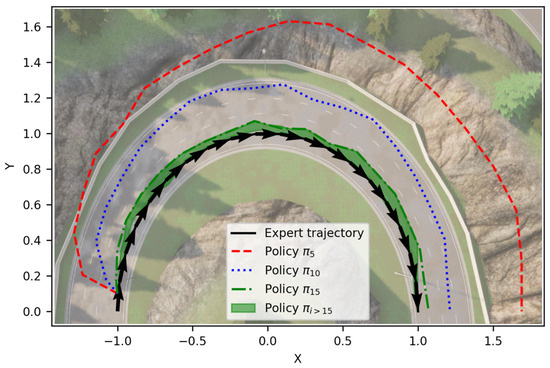 Direct policy learning (DPL) builds on behavioral cloning by attempting to leverage a given expert at training time to overcome some of the limitations of behavioral cloning [6]. Our imitation learning approach is a DPL method; therefore, here, we explore the related work in detail. One of the prominent works [41] proposed the DAgger algorithm, which is an online imitation learning algorithm. The idea was to start with a random policy for the imitation learning agent and let it engage with the environment. During the first interaction, for each state, the agent queries an expert for its control parameters for each of the states in the trajectory. This gathered dataset is used to train the initial policy of the agent. During the next episode, the agent is allowed to interact with the environment again to gather more data points for the dataset. These collected state–action pairs are aggregated to the previously collected dataset, and the policy is trained again with this new dataset. This process is repeated to gather more data points to enrich the dataset with the relevant state–action pairs for the task. In DAgger, the way the agent interacts with the environment is controlled by a proportion of expert control and the training agent so that the agent trajectories are controlled in such a way that they are not idling to unsafe or irrelevant states and they are not strictly following expert trajectories only. In initial training iterations, the expert has more control over the agent, and as the training progresses and the training agent becomes better at the task, some portion of the control is transferred to the training agent to allow for a controlled state exploration. Building on the DAgger algorithm, [42] proposed SafeDAgger to minimize the number of queries from the expert, as this is costly. It introduces an additional safety policy to predict the likelihood of the agent deviating from the expert trajectory. This improved the learning rate and reduced the number of expert queries. In both of these works, the performance is evaluated via simulations. In Ref. [43], a novel algorithm is proposed to train end-to-end systems called observational imitation learning (OIL). OIL is an online learning method that tries to imitate the best behavior out of a set of sub-optimal teachers. The Sim4CV [44] simulation environment was used to evaluate OIL.