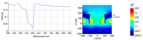 Within the wavelengths of 550–590 nm, there was evidence of a peak originating from the Si3N4 and Au interlayer, gradually widening and starting to overlap with the Au resonance peak as the thickness of the Au layer decreased. The optimal outcome, achieved with a 75 nm Au thickness, is presented in Figure 5, illustrating both the transmission and electric field enhancement results. The “hot spots” on the NHA are observed as red spots in the electric field enhancement results in Figure 5 (right). These simulation results provided the employed fabrication parameters.
