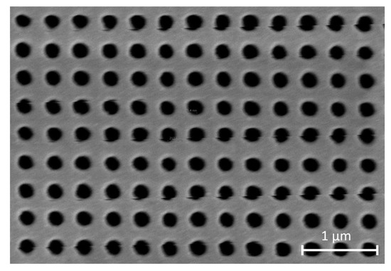NHA fabrication results were verified by scanning electron microscope (SEM) imaging. The diameter and period dimensions were measured to be 200 nm and 400 nm, respectively, as shown in Figure 6.