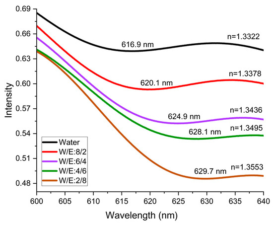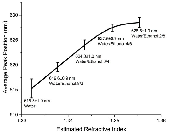 Figure 7 presents spectral fits for data acquired in one trial from the NHA covered by water–ethanol mixtures, serving as an illustrative example of the spectrometer measurements. In these fits, the peak positions for the different water–ethanol volume fractions (1/0, 0.8/0.2, 0.6/0.4, 0.4/0.6, and 0.2/0.8) were determined to be 616.9 nm, 620.1 nm, 624.9 nm, 628.1 nm, and 629.7 nm, respectively. Notably, a consistent shift in the peak position is observed with an increase in estimated refractive indices, confirming the sensor’s capability to detect and differentiate changes in the refractive indices of the test solutions.