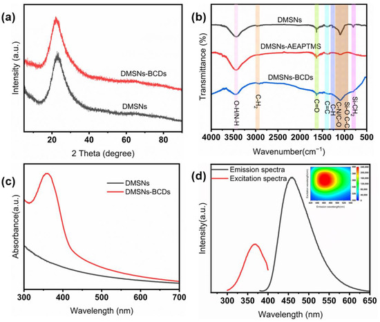 The composition of the DMSNs-BCDs was studied using X-ray diffraction (XRD), Fourier transform infrared (FT-IR) technology, UV-visible absorption, and fluorescence spectra. The XRD diagram is shown in Figure 3a. The DMSNs and DMSNs-BCDs show a wide peak centered at 22°, indicating that CDs grow on the surface of DMSNs without fixed carbon. The functional groups of DMSNs-BCDs were studied in depth using Fourier transform infrared spectroscopy (FT-IR) (Figure 3b). The characteristics of DMSNs are basically the same as reported in the literature [36]. For DMSNs-BCDs, these include O-H (3450 cm−1), C-H2 (2918, 2850 cm−1), C-O (1657 cm−1), C-C (1564 cm−1), C-H (1383 cm−1), and Si-CH2 (806 cm−1). Additionally, the strong and wide absorption band at 900–1300 cm−1 belongs to C-C, Si-O, and C-O/C-N. The enhanced absorption peak intensity at 3450 cm−1 for DMSNs-AEAPTMS indicates the presence of N-H, which further confirms the reaction mechanism illustrated in Figure 1a. The entire reaction mechanism can be described as follows: The surfaces of the DMSNs contain a large amount of -OH, while AEAPTMS is an alkylating agent with an alkoxy group at one end and an amino group at the other. During the grafting of AEAPTMS onto the DMSNs, ammonia promotes the hydrolysis of the alkylating agent, forming Si-O-Si bonds. The amino group at the tail end of AEAPTMS can directly bond with CA, and MSP is doped in the form of a phosphorus source during the bonding process. As shown in Figure 3c, the absorption peak of DMSNs-BCDs occurs at approximately 360 nm. This further proves the successful in situ synthesis of carbon dots. As shown in Figure 3d, the emission wavelength of DMSNs-BCDs is 460 nm under the optimal excitation wavelength of 360 nm. DMSNs themselves are non-fluorescent; it is the successful synthesis of carbon dots that imparts fluorescence. At the optimal excitation wavelength of 360 nm, the emission wavelength of DMSN-BCDs is 460 nm. This is corroborated by the 3D fluorescence spectrum, further affirming the significance of DMSNs as carriers. The horizontal axis represents emission wavelength, while the vertical axis represents excitation wavelength (Figure S2).