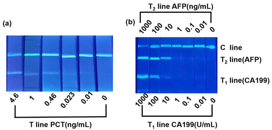 (a) Picture of the DMSNs-BCDs-LFIA detecting different concentrations of PCT solutions; (b) DMSNs-BCDs-LFIA two-component detection photographs of CA199 and AFP.