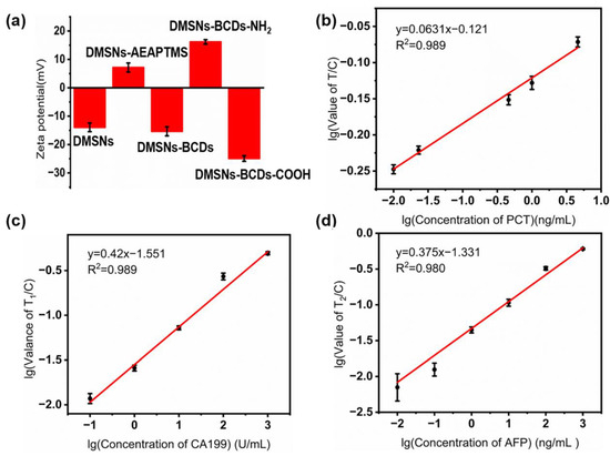 (a) ζ potential of DMSNs, DMSNs-AEAPTMS, DMSNs-BCDs, DMSNs-BCDs-NH2, and DMSNs-BCDs-COOH; (b) linear response of the DMSNs-BCDs-LFIA to PCT detection, with a concentration range of 4.6 ng/mL–0.01 ng/mL; (c) linear response of the DMSNs-BCDs-LFIA to CA199 detection, with a concentration range of 1000 U/mL–0.1 U/mL; and (d) linear response of the DMSNs-BCDs-LFIA to AFP detection, with a concentration range of 1000 ng/mL–0.01 ng/mL.