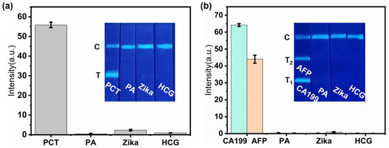 Study on the specificity of a DMSNs-BCDs-LFIA test strip to different interfering proteins. ((a) single-component detection; (b) dual-component simultaneous detection).