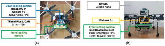 Installation of the hardware in (a) the bottom view of the UAV and (b) the front view of the UAV.