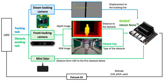 To facilitate tracking and obstacle avoidance, three supplementary sensors were incorporated into the UAV. First, the Raspberry PiCamera V2 served as the downward-facing camera, enabling the UAV to discern its displacement from the tracking line. Second, an Intel Realsense D455 was utilized as the forward-facing camera to capture both the depth and RGB images of obstructions. Finally, the TFmini Plus LiDAR was integrated to measure the vertical distance between the UAV and either the floor or any prominent obstacle beneath.