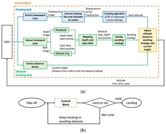 The implementation architecture is shown in Figure 3a. For path tracking, UAV ground displacement data are obtained from a downward-facing camera, and either the enhanced carrot-chasing algorithm or the LFPF algorithm is used to adjust the orientation of the UAV. In tackling obstacle avoidance, the depth of an impediment can be ascertained by applying thresholds to the depth image. Concurrently, the nature of the obstacle is derived from the RGB image using YOLOv4-Tiny. After mapping the depth and type classifications of the obstacles, the strategy for avoidance is chosen. The rangefinder provides the distance between the UAV and the ground or the obstacle below it. Ultimately, a new attitude is generated by considering the tracking, obstacle avoidance, and current height results. Figure 3b uses the control block in Figure 3a to demonstrate the implementation flow chart.