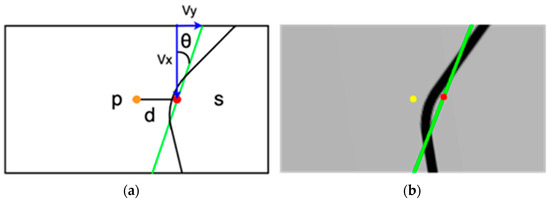 (a) The concept of the LFPF algorithm; (b) the curve captured by the ROSCAM with a fitted line, point s (red dot), and p (yellow dot).