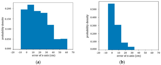 (a) PDF of the x-axis error in the improved carrot-chasing algorithm; (b) PDF of the x-axis error in the LFPF.