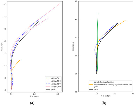 A comparison of the bend-tracking task results of the carrot-chasing algorithm, improved carrot-chasing algorithm, and LFPF algorithm are shown in Figure 9b. Both the improved carrot-chasing algorithm and the LFPF algorithm smoothly performed the turn.