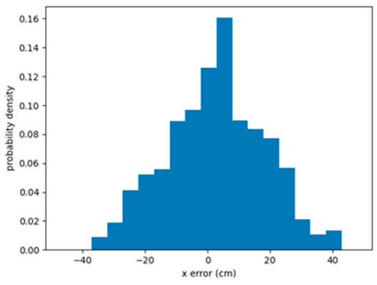 With the parameter list shown in Table 2, the UAV can perform the tracking task using the LFPF algorithm during an actual flight. The PDF of the x-axis error over 10 flights of the 10 m straight line is shown in Figure 10. The UAV could maintain its displacement within ±40 cm, with a mean displacement of 13.30 cm.