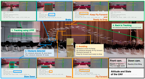 The UAV is outfitted with a downward-facing camera and a forward-facing depth camera. For path tracking, the device gleans displacement data from the downward-facing camera and harnesses either the enhanced carrot-chasing algorithm or the LFPF algorithm to adjust its orientation. In tackling obstacle avoidance, the depth of an impediment can be ascertained by applying thresholds to the depth image. Concurrently, the nature of the obstacle is derived from the RGB image using YOLOv4-Tiny. Ultimately, the strategy for avoidance is chosen by considering both the depth and type classifications of the obstacles.