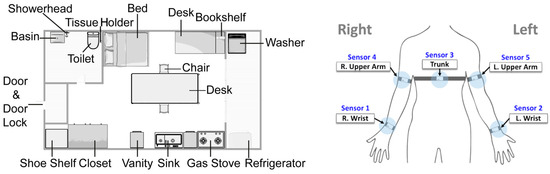 Experimental studio space (left panel) and sensor attachment locations (right panel). The studio was divided into sleeping areas, study room, bathroom, veranda, kitchen, and living room, distinguished by the arrangement of furniture. Participants wore five sensors on their bodies (two on the wrists, two on the upper arms, and one on the trunk) and performed range of motion and activities of daily living tasks according to a predetermined scenario. The experimenters demonstrated each movement to the participants in advance, and the participants were instructed to replicate that movement exactly.