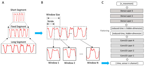 Data preprocessing and the model structure. For brevity, only a single channel time-series (the red curves) is shown as a demonstration. The horizontal blue arrows indicate the flow of data processing. (A) Linear interpolation. Segments of varying lengths are interpolated to have a fixed length. (B) Sliding windows. The fixed-length segment is sliced into multiple windows that move with a length of stride. (C) The model structure. The gray boxes represent layers of the neural network, and the white boxes represent the processed data dimensions.