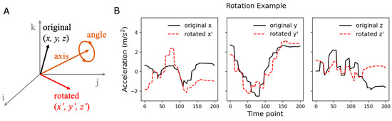 Axis rotation. (A) Visualization of axis rotation. The sensor values form a vector (“original”) and are rotated by a random angle with respect to a randomly chosen axis. (B) Rotation example. Black solid lines indicate x, y, and z components of an accelerometer and red dashed lines denote rotated components.