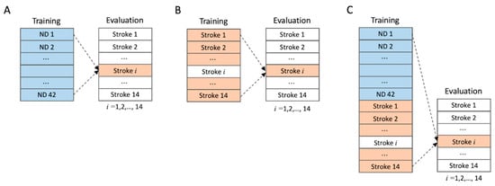 As this study aimed to enhance the classification of the movements of stroke patients, we first examined how different combinations of ND and Stroke training groups affected the evaluation results of stroke patients. Therefore, according to the study design, the Stroke group must be included in both the training and evaluation sets. Because any machine learning model should not have the same data in the training and evaluation sets, we adopted leave-one-subject-out cross-validation (LOSO-CV) as the main evaluation method (Figure 4). In LOSO-CV, only one participant from the target group (the Stroke group in our case) is kept from the training group, and the model performance was evaluated using the remaining participant after the model was trained using the other participants’ data. This process was repeated as many times as the number of participants, and the evaluation result for each participant was averaged to obtain the LOSO-CV evaluation result. For our study design, we tested three different training conditions: ND only, Stroke only, and ND + Stroke. For ND-only training, the training group was the ND group and the evaluation group was the Stroke group, in which the ordinary separate training and test groups were applied without the use of LOSO-CV. For Stroke-only training, the training group comprised only the Stroke group, and LOSO-CV was applied. Finally, for the ND + Stroke training, the training group was a combination of the ND and Stroke groups, whereas the evaluation was estimated in the Stroke group using LOSO-CV.