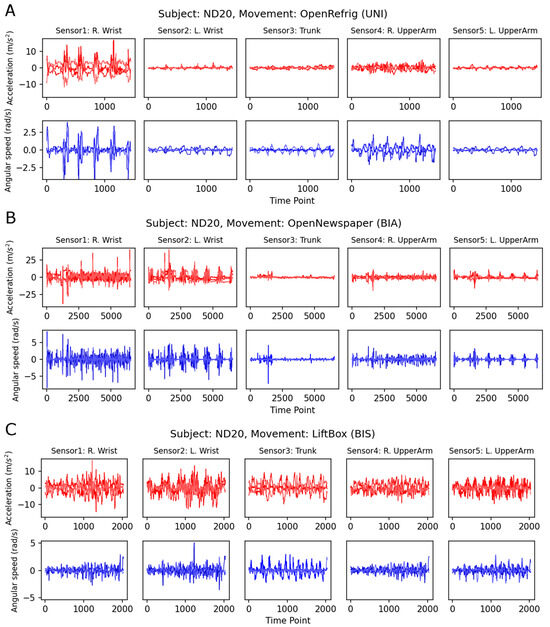 Sample plots of three movements of the same participant (ND20) in the ADL task. (A) OpenRefrig—UNI, (B) OpenNewspaper—BIA, (C) LiftUpDownBox—BIS. Red lines: accelerometer channels, blue lines: gyroscope channels. Note that the scales of the horizontal (time points) and vertical (sensor values) axes across panels are different. OpenRefrig: open and close refrigerator, OpenNewspaper: open a newspaper; LiftBox: lift the box up and down; UNI: unimanual; BIA: bimanual asymmetric, BIS: bimanual symmetric; R: right; L: left.