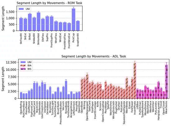 Average segment length of each movement of all participants. Segment length is in time points. Error bars represent standard errors. Each segment consists of five repetitions of the same movement. Movements are divided into three groups according to their asymmetricity: UNI, BIA, and BIS. UNI, unimanual; BIA, bimanual asymmetric; BIS, bimanual symmetric. Note that scales of the vertical axes are different between the two tasks. (Up) ROM task. (Down) ADL task.