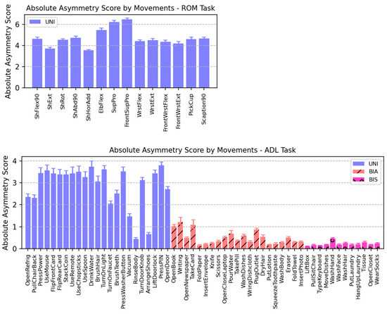 Absolute asymmetry score (AAS) of each movement averaged across participants. Regardless of right- or left-dominated, higher AAS indicates more asymmetrical movements, whereas lower AAS represents symmetrical movements in terms of energy. Note that scales of the vertical axes are different between the two tasks. (Up) ROM task. (Down) ADL task. UNI, unimanual; BIA, bimanual asymmetric; BIS, bimanual symmetric.