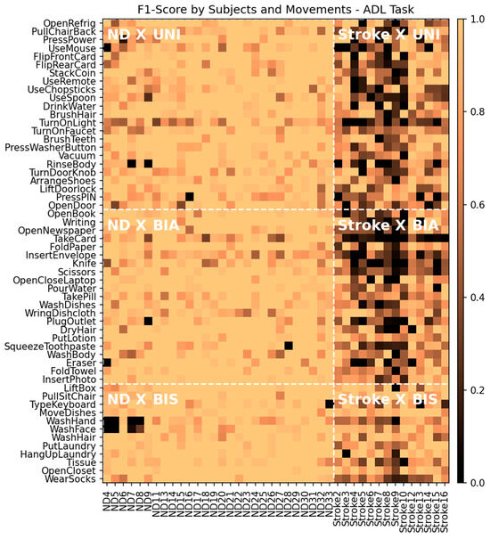 Figure 8 shows a colormap of the F1-scores of the individual segments in the ADL task with the corresponding participants (columns) and movements (rows). Again, these F1-scores were obtained from the ND + Stroke training group using the original data. The color map is divided into six subregions according to the combination of subject group and movement type to which each segment belongs (denoted by white bold letters and bordered by white dashed lines): ND × UNI, ND × BIA, ND × BIS, Stroke × UNI, Stroke × BIA, and Stroke × BIS. Table 7 summarizes the mean and standard deviation of the F1-scores of the windows in each subregion. The ND group exhibited no significant difference in the F1-scores among the three movement types. In contrast, in the Stroke group, the F1-score of the BIS movement was significantly higher than that of the other two movement types (p < 0.001 for all). However, the BIA and UNI for the Stroke group did not differ in F1-score (p = 0.226). This indicates that the symmetricity of movement affects the model performance only when movement patterns are abnormal, as in patients with stroke.