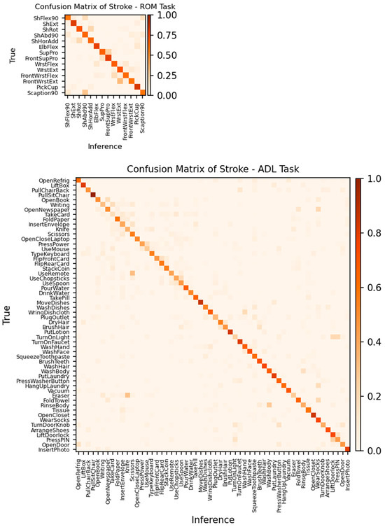 Figure 9 shows the confusion matrices of the Stroke group for ROM and ADL tasks. The training condition was the same ND + Stroke as that of the original data. In the confusion matrix, the movements in the row represent true classes and those in the column represent the model inference. Therefore, the diagonal elements (row index = column index) are the “right guess”, whereas all off-diagonal elements are considered as the model’s “confusion” or wrong answers. Confusion matrices provide information not only on the global performance metric but also on which movement class was mostly confused with another class by the trained model. Table 8 shows some of the most confused movement pairs for each task.