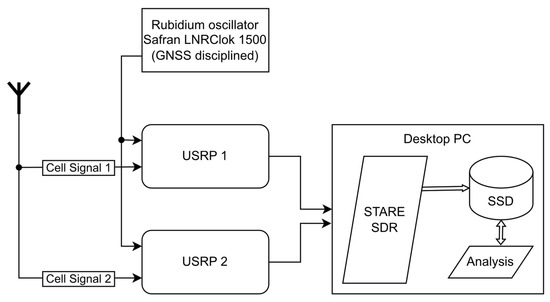 The system used for data collection comprised one or two Ettus Research (Ettus Research, a National Instruments Brand. 11500 North Mopac Expressway. Austin, TX 78759, USA) Universal Software Radio Peripheral (USRP) devices (model B200/210), which were connected to a multiband cellular antenna and linked to a computer via USB3 for data streaming, processing, and storage. The measurements and observables were generated by the real-time SofTwAre REceiver (STARE), which is a software-defined radio (SDR) that was specifically developed for measurement and observable generation from LTE and 5G new radio (NR) cellular downlink signals [12,13]. A diagram of the test setup can be found in Figure 1. The specific software version of STARE used in this study was v.1.4.0, which was, in turn, linked with a UHD, version 4.1.0.5-3.