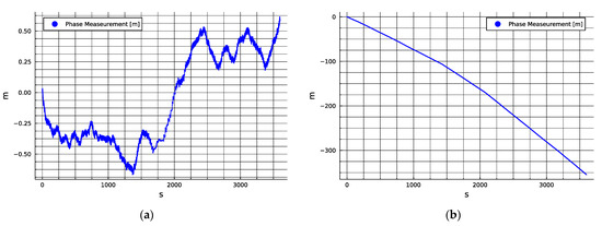 (a) This station demonstrates a peak-to-peak one hour deviation of less than 1.25 m, which is equivalent to a time delta of 4.2 nanoseconds; (b) this station demonstrates a much higher level of deviation equivalent to more than 1200 ns.