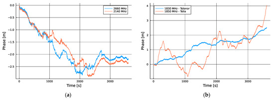 (a) Phase measurement instability between two Telenor cells; (b) phase measurement instability between one Telenor cell and one Telia cell.
