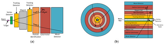 In general, to achieve complete detection of all particle parameters, detectors are usually constructed in layers (planar layers in the case of fixed targets (Figure 1a) and shell layers in the case of colliders (Figure 1b)), with each layer dedicated to a specific task.