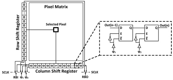 Two separate shift registers (SRs) were used for pixel selection and located just outside the pixel array (see Figure 4).