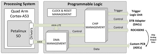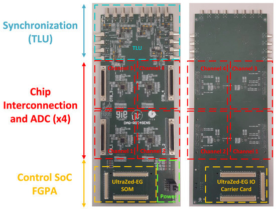 The implemented system is based on three boards: an UltraZed-EG SOM board from AVNET [32], the associated UltraZed-EG IO Carrier Card [33], and a custom PCB designed for the application. In addition, the chips are connected to the custom PCB via a ribbon cable. We retained both the PCB support and the DTB adapter (to generate chip supply and reference voltages) from the previous system. Moreover, a dedicated power supply board was designed to allow for remote system power management. Figure 6 shows an image of the developed system.