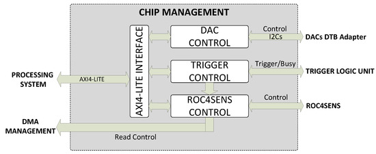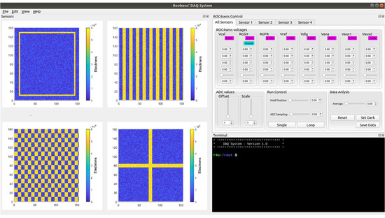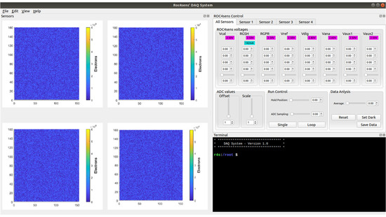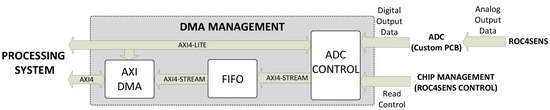 Moreover, the implemented system improves versatility by facilitating adaptation to different reader chips. In the case of detectors with analog output, adapting the system would mean replacing the controller within the programmable logic. Furthermore, in terms of hardware, the adaptation would require the modification of the adapter card (DTB adapter for ROC4SENS) in order to connect the corresponding chip to the custom board PCB of the proposed system. In the case of detectors with digital outputs [38,39,40], the hardware adaptations would go beyond the changes mentioned above, as they would also involve the elimination of the ADCs and the direct connection of the digital outputs to the FPGA SoC. In terms of software, the changes would be minimal and would involve adapting the configuration parameters for the new chip and visualizing the results for different pixel array sizes.