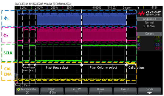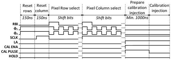For each of the channels, a sequence of commands has been executed to read and calibrate the matrix row by row. The procedure started by resetting the row and column shift registers. Then, the system was positioned on the first row and the pixels to be calibrated were selected (the calibration was performed on the whole column, and thus, the columns to be calibrated were selected). Finally, the selected pixel columns were calibrated and then the entire row was read. The same procedure was then carried out for the next row until the matrix was complete. The procedure with the control signals is shown in Figure 15.