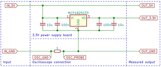 In order to measure the time and energy required for individual operations, a test bench was constructed. One of the microcontroller’s pins was used as output producing a signal similar to the gating signal in terms of concept, with high logical level during measured operation and low level otherwise. This signal was measured using an oscilloscope, along with the voltage drop across the 1 shunt resistor to measure current using Ohm’s law. The current measuring method is shown in Figure 1. Only the required peripherals of the microcontroller were powered—that is—appropriate General-Purpose Input/Output (GPIO) ports in order to use the microcontroller’s pins, and UART for transmitting the size of compressed data that also served as an indicator if the compression was successful, as large enough data can exhaust the microcontroller’s memory with certain algorithms, causing the microcontroller to crash. The measurements were conducted using a maximum available clock speed equal to 100 MHz.