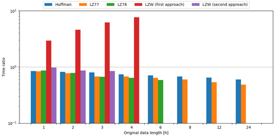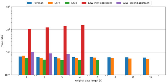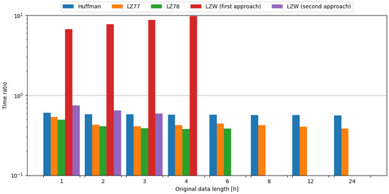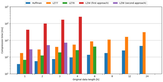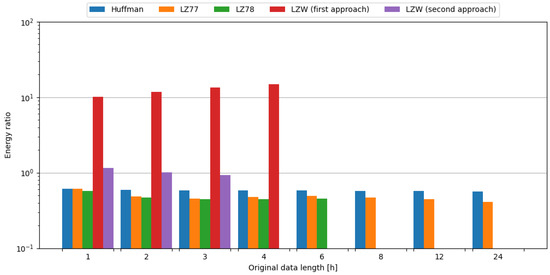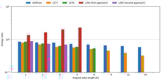 Lempel–Ziv–Welch (LZW) [36] is a lossless data compression algorithm based on LZ78. In terms of implementation, the dictionary index is variable-width encoded in the same way as LZ78. The dictionary was implemented as a vector containing objects composed of a dictionary index and a string of symbols in the form of std::vector<uint8_t>. Due to the brute-force match search of this implementation, measured execution time and required energy were not acceptable. A second approach—utilizing a hash map—was tested, with the dictionary rewritten as std::unordered_map, with a string of symbols in the form of std::vector<uint8_t> as a key and dictionary index as value. Due to the fact that there is no implementation of std::hash<vector<uint8_t>> in C++, a custom hash solution for std::vector<uint8_t> was required—Fowler/Noll/Vo (FNV) hash algorithm [37] was chosen for this task, as utilizing std::hash<std::string> is not a resource-efficient approach.
