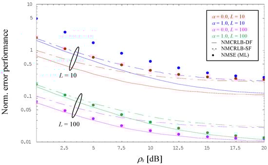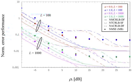 For and L = 1000, the error performance of MB estimates is close to the normalized asymptotic CRLB for the dual-filter solution expressed by (47), in Figure 4 denoted by NACRLB-DF and depicted in dashed style. In this context, it is to be recalled that—similar to NMCRLB-DF—the asymptotic variant is also proportional to (1 + α)/L. Not surprisingly, a non-negligible discrepancy is observed for smaller observation intervals, as exemplified by L = 100, the reason for which is a non-negligible bias effect exhibited by the MB algorithm. This sort of degradation vanishes more and more with increasing values of L, as confirmed by Figure 5.