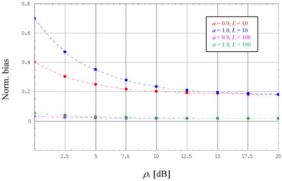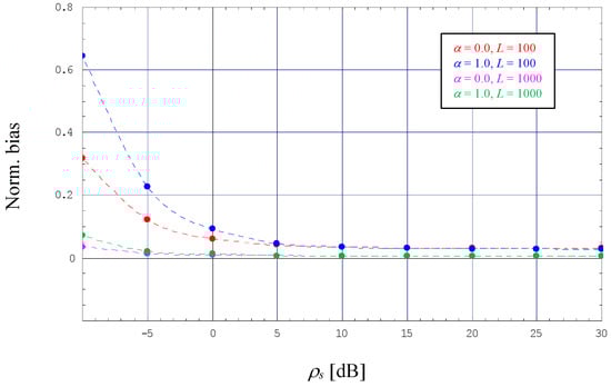 However, with L = 10, we also observe that the ML estimator developed in Section 3.3 performs a normalized mean square error (NMSE) with a non-negligible amount of degradation, i.e., although evolving in parallel to the NMCRLB-DF, the difference to the theoretical limit is considerable. The reason for this deficiency is a significant bias effect, which is detailed in Figure 3 (the dotted lines are not related to any analytical work; they are just obtained by cubic interpolation of the simulation results embodied by solid dots in different styles). Nevertheless, the diagram also demonstrates that the bias might be reduced significantly when we increase the length of our pilot sequence to L = 100. This is confirmed by Figure 2, where the NMSE generated by the corresponding ML estimator is now very close to NMCRLB-DF.