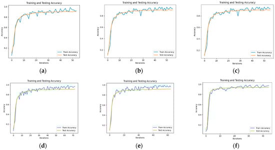 Model Text Classification Accuracy: (a) BERT Model Text Classification Accuracy; (b) BERT-CNN Model Text Classification Accuracy; (c) BERT-RNN Model Text Classification Accuracy; (d) BERT-RCNN Model Text Classification Accuracy; (e) BERT-DPCNN Model Text Classification Accuracy; (f) ERNIE Model Text Classification Accuracy.