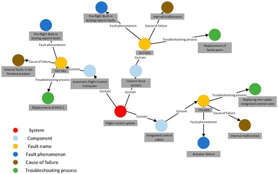 Currently, there is limited integration of knowledge graphs in the field of aircraft Prognostics and Health Management (PHM). However, the combination of knowledge graphs with aircraft PHM holds significant potential for broad applications and high utility. While research on knowledge mapping has made some headway in the realm of aircraft manufacturing [11], its application in aircraft PHM is still in its early stages. For example, Zhang [27] introduced the BERT-BiLSTM-CRF algorithm for identifying defective entities in aero-engines but did not provide further details on the construction method for the aero-engine fault knowledge graph. In a similar vein, Nie [28] proposed key technologies for constructing knowledge graphs related to aircraft power system fault diagnosis and conducted exploratory applications of intelligent systems. Additionally, Wu [29] utilized the BERT-BiLSTM-CRF algorithm for entity relationship extraction within the aero-engine lubrication system, subsequently constructing a fault knowledge graph for this system. Tang [30] employed deep learning as the primary method and heuristic rules as an auxiliary method to extract fault knowledge from both structured and unstructured fault data, leading to the construction of a fault knowledge graph for a specific type of process. Furthermore, Meng [31,32] presented a method for constructing a fault knowledge graph for aircraft power system health management and developed an intelligent Q&A system based on this knowledge graph, resulting in a significant enhancement of maintenance personnel’s troubleshooting abilities.