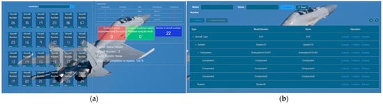 As illustrated in Figure 13, the data management module plays a crucial role in the PHM system by providing unified management of heterogeneous data from multiple sources. Figure 13a showcases the aircraft status overview interface, which offers a comprehensive view of aircraft status data. This includes information on aircraft failures, troubleshooting progress, and historical failure records. Users can easily access and analyze this data using the aircraft status overview map. Figure 13b presents the equipment information interface, enabling users to visualize the structural composition of data between different aircraft systems. This map allows for a clear understanding of how data is interconnected and provides insights into the relationships and dependencies among various components. By facilitating the effective management and organization of diverse data, the data management module establishes a solid foundation for the PHM system’s operations, enhancing its ability to handle data from multiple sources efficiently and cohesively.