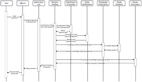 Figure 14 showcases the sequence diagram of the natural language question and answer module. The process begins with the user inputting a question, which is then passed from the front-end to the back-end. The question classification part identifies the question type using user intent classification labeling tags and keyword lists. Next, in the entity identification part, the entity within the question is determined. Once the question’s entity and category are obtained, they form the basis for constructing a Cypher query statement. This Cypher query statement is then passed to the Neo4j graph database. The Neo4j graph database processes the query and returns an array of Answers. Based on the question’s category, an answer generation template is used to format the array of answers into a natural language form. This formatted answer is returned to the front-end and presented to the user for reading. Figure 15 showcases the flowchart of the smart Q&A system, providing a visual representation of the overall process.
