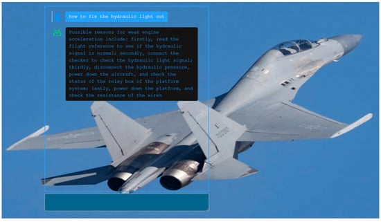 In Figure 16, the user inputs the question “how to fix the hydraulic light out”, the front-end passes the question to the back-end, and the back-end determines that the type of the question is “troubleshooting process” based on “how to fix” in the sentence. The entity extraction part extracts the entity “hydraulic light is out”, the combination result and the node “hydraulic light does not light up” in the graph have the closest similarity, and the entity type of the question is “hydraulic light does not light up”, according to the entity type of the question “hydraulic light does not light up”, the entity type of the question is “hydraulic light does not light up”. The entity type of the question is “hydraulic light is not on”, and according to the entity and the type of the question, the Cypher query statement Cypher statement “MATCH (n {name: ‘Hydraulic light is not on’})-[r1:Relation {name: ‘Troubleshooting process’}]->(m)RETURN n.name, m.name” is generated, which can be obtained as the return result [{‘Hydraulic light is not on’}]->(m)RETURN n.name, m.name”. Result[{‘n.name’: ‘Hydraulic light is not on’, ‘m.name’: ‘Read the flight reference, make sure the hydraulic signal is normal’}, {‘n.name’: ‘Hydraulic light is not on’, ‘m.name’: ‘Connect the checker, check the hydraulic light signal’}, {‘n.name’: ‘Hydraulic light is not on’, ‘m.name’: ‘Disconnect the hydraulic pressure, power down the plane., check platform system relay box status’}, {‘n.name’: ‘Hydraulic light not on’, ‘m.name’: ‘Platform powered down, check wire resistance’}]. The result is passed to the intelligent answer generation section, and the “troubleshooting process” corresponds to the template. Finally, the answer “Possible reasons for weak engine acceleration include: firstly, read the flight reference to see if the hydraulic signal is normal; secondly, connect the checker to check the hydraulic light signal; thirdly, disconnect the hydraulic pressure, power down the aircraft, and check the status of the relay box of the platform system; lastly, power down the platform, and check the resistance of the wires” is generated and passed to the front-end display. The answer to the question was passed to the front-end display.