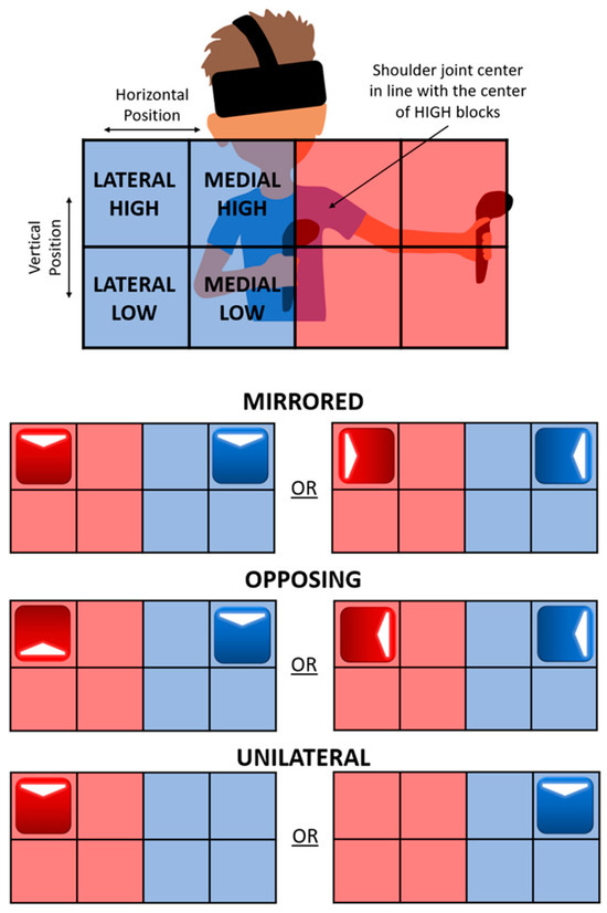 The Vive Pro VR system (HTC, Taichung City, Taiwan) was used to create and immerse the participants in the virtual environment. The headset uses an AMOLED display with a 90 Hz refresh rate, a 110-degree field of view, and synchronized audio. The commercially available game, Beat Saber (Beat Games, v1.12.1, Prague, Czech Republic) presents songs with target blocks in specific placements on a grid and tasks the participant to move in a slicing motion through the middle of the block in a certain direction with a lightsaber-based on the song’s beats (the motion of the lightsaber reflects a 1-m vector extending from the end of the handheld controller and matching the handheld controller’s orientation). In addition to pre-defined levels, the software has a graphic user interface that allows full customization of user-defined levels. This includes any choice of song, target speed, target block placement in the grid, and target direction in which target blocks must be sliced in half with the motion of the lightsaber.