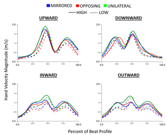 Hand velocity magnitude trajectory normalized to the beat profile and separated into each cardinal movement task direction. Movement levels and vertical task position are shown by line color and line style, respectively.