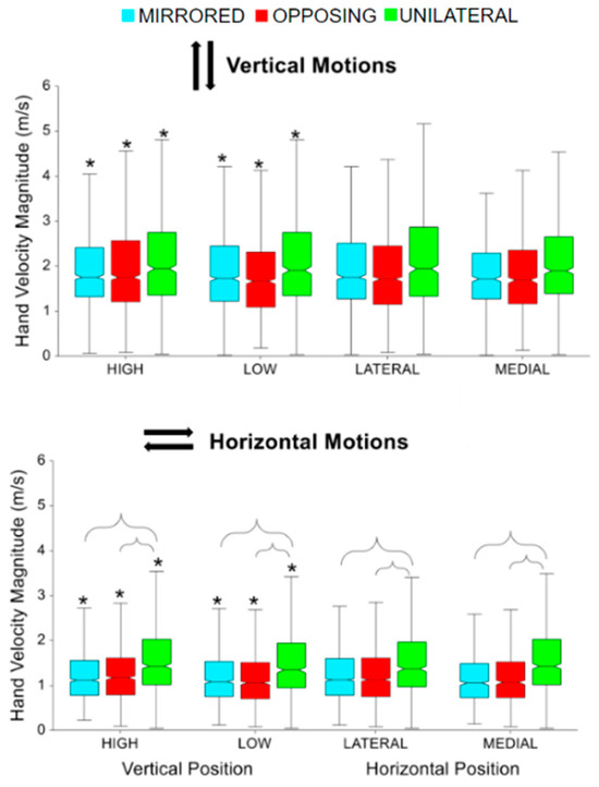 Peak hand velocity magnitude for vertical and horizontal movements comparing task position and movement level. The * symbol indicates a significant difference between metrics due to the vertical or horizontal within a movement level, e.g., between unilateral high and unilateral low. Brackets indicate a significant difference between movement levels, e.g., between unilateral high and mirrored high.