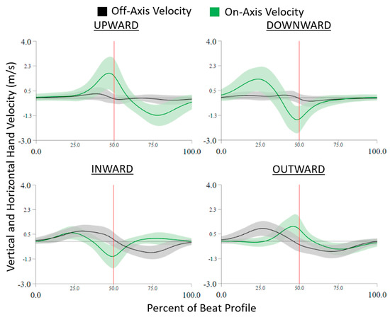 The on- and off-axis velocity trajectories during each beat profile are shown in Figure 4. Right around the beat, the on-axis velocity peaks and the off-axis crosses zero. For upward tasks, the on-axis velocity has a positive peak and downward tasks have a negative peak. The same is true for inward and outward, where inward has a negative peak and outward has a positive peak. For absolute hand velocity, in Figure 5, factors of cardinal movement direction type and hand velocity axis were found significant (all p < 0.0001, p > 0.99).