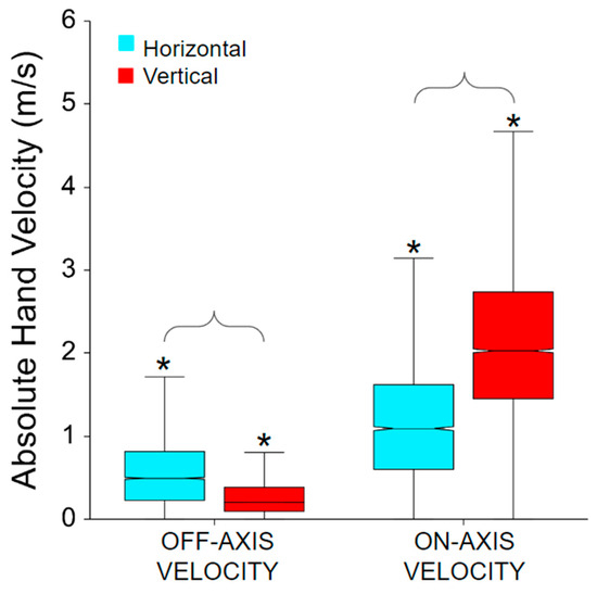 Absolute hand velocity for on- and off-axis as well as horizontal and vertical movement task direction. All interactions are significant. The * symbol indicates a significant difference between on- and off-axis velocities within the same movement direction, e.g., between horizontal off-axis and on-axis velocities. Brackets indicate a significant difference between movement directions, e.g., between off-axis horizontal and off-axis vertical velocities.