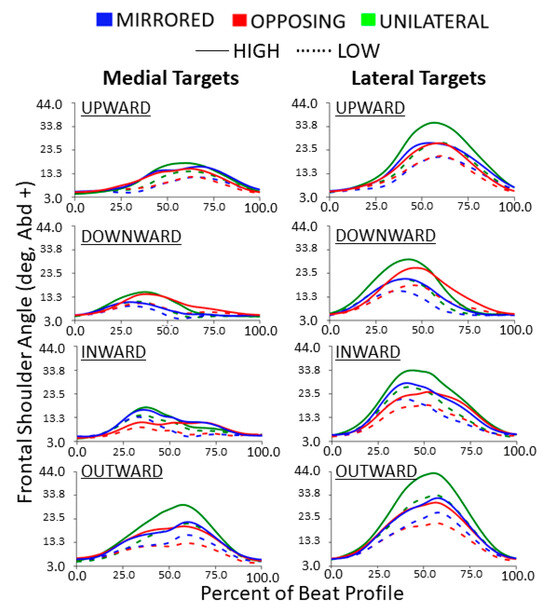 The frontal shoulder abduction/adduction trajectories during each beat profile are shown in Figure 6. Trajectories highlight that upward and outward tasks result in the kinematic peak shoulder abduction occurring between 50% and 75% of the beat profile. Conversely, downward and inward tasks result in kinematic trajectories that roughly mirror the opposite direction task and have peak angles between 25% and 50% of the beat profile. Compared to medial targets, lateral targets consistently resulted in more exaggerated frontal plane shoulder behaviors. Inward compared to outward cardinal movement task directions (horizontal movement tasks) as well as upward compared to downward cardinal movement task directions (vertical movement tasks) are near reflections with the exception of the unilateral movement level. All profiles are bell-shaped with the horizontal movement tasks reaching a higher peak than the vertical movement tasks. Unilateral movements tended to have larger shoulder abduction and less consistency between cardinal movement task directions around the beat. Lateral targets tended to have more shoulder abduction overall.